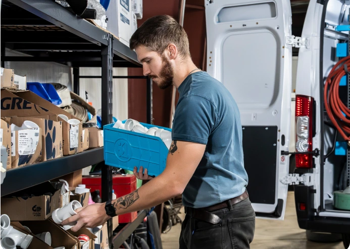 Storage bins and lids secure tools and materials, protecting them from dust, dirt, and damage while on the move.