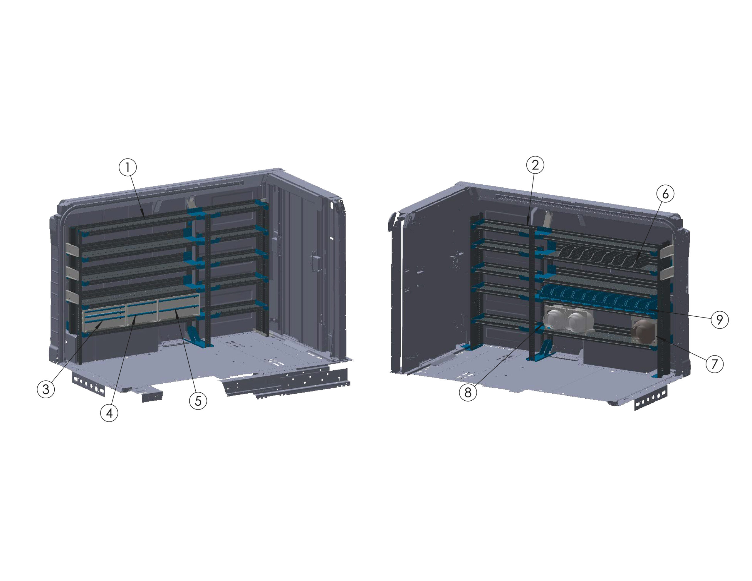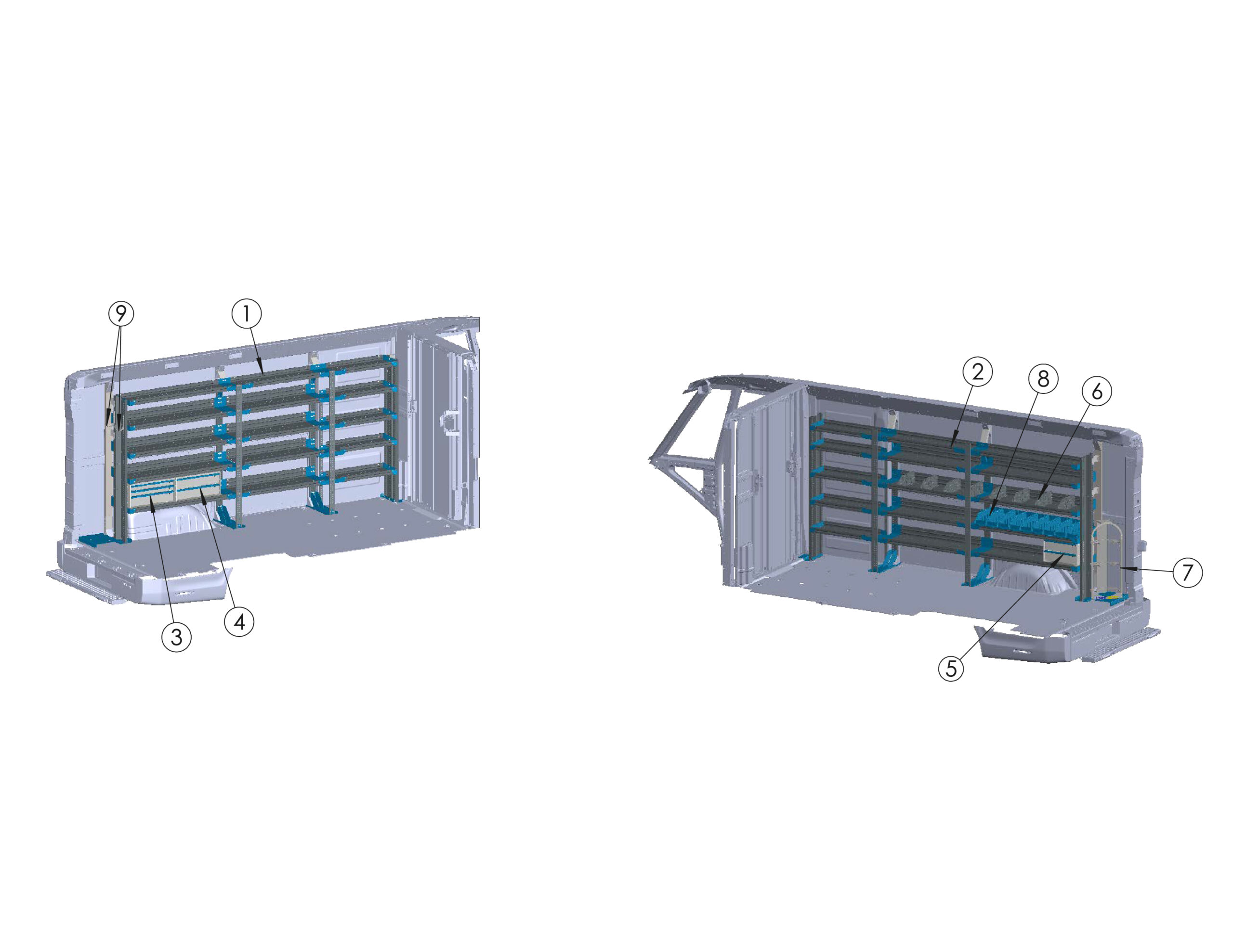| 9 | Partition Panel Kit, (1) Solid Panel, (2) Visibility Panels | S1M2C2FSV | x1 |