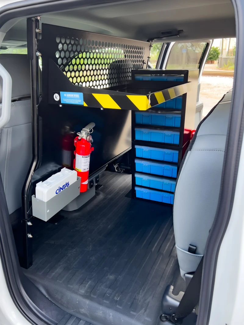 The compact first aid kit mounted holder is designed to keep essential medical supplies secure, organized, and easily accessible in tight spaces. Ideal for work vans, service trucks, and other mobile or confined environments.